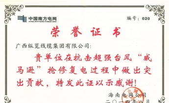全國電線電纜產(chǎn)品質(zhì)量監(jiān)管AA級(jí)企業(yè),全國重合同守信用單位,廣西“二十五”電線電纜產(chǎn)業(yè)重點(diǎn)扶持企業(yè),國家強(qiáng)制性產(chǎn)品CCC認(rèn)證